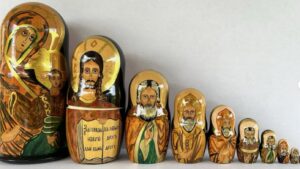 Van egy különös matrjoska babánk. Máriában van Jézus. A kicsi, az ember hordozza a nagyot, a Teremtőt. Őbenne vannak a szentek, akik egyszerű, földi életet éltek, de valamiképpen Istent hordozták. Tehát Istenben vannak. Végül ebben a matrjoska babában van egy angyal, az Isten követe. Tőle és hozzá tartanak, benne és belőle vannak a dolgok.